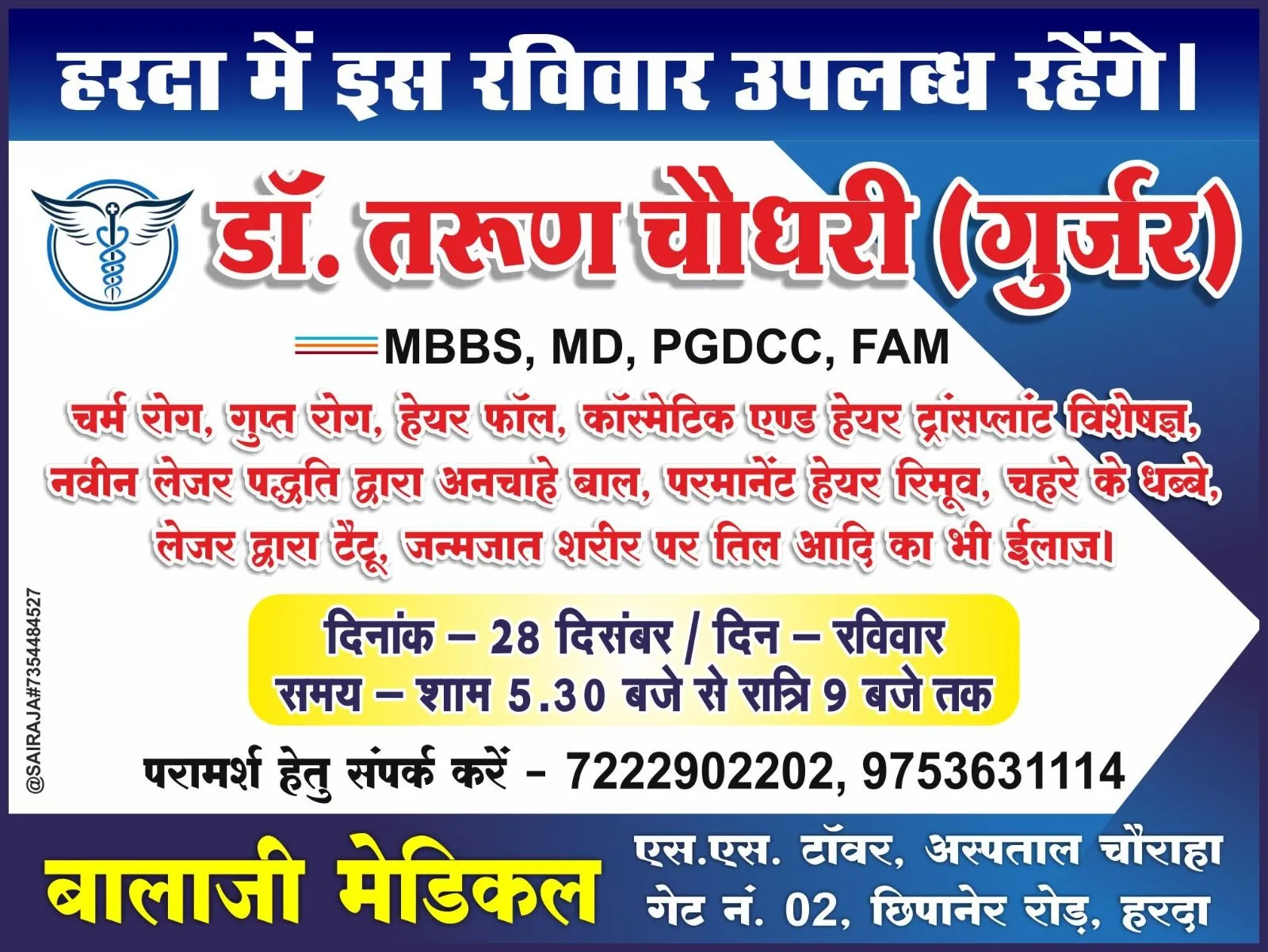 हरदा – इस बार शनिवार और रविवार 27/28 दिसंबर को हरदा में उपलब्ध रहेंगे चर्म रोग विशेषज्ञ डॉ. तरुण गुर्जर / गुर्जर मेडिकल स्टोर पर !