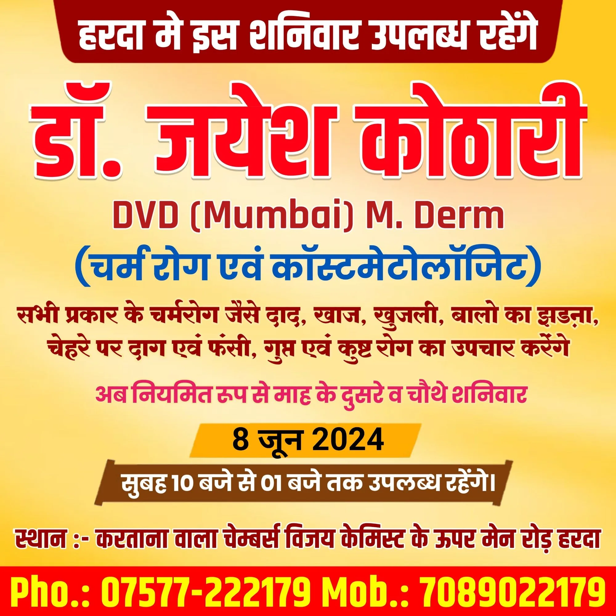 हरदा – चर्म रोग विशेषज्ञ डॉ जयेश कोठारी इस शनिवार परामर्श हेतु 8 जून को करताना वाला चेम्बर में उपलब्ध रहेंगे !