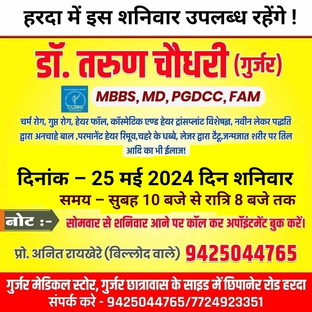 हरदा – इस बार इस शनिवार 25 मई को हरदा में उपलब्ध रहेंगे चर्म रोग विशेषज्ञ डॉ. तरुण चौधरी (गुर्जर) गुर्जर मेडिकल स्टोर पर !