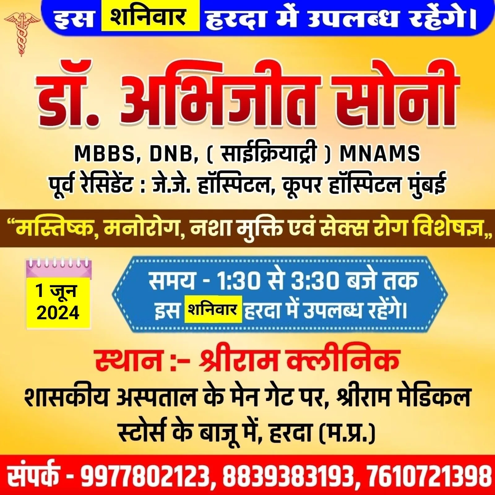 हरदा – मस्तिष्क, मानसिक रोग, नशा मुक्ति व सेक्स रोग विशेषज्ञ डॉ अभिजीत सोनी 1 जून शनिवार को श्री राम मेडिकल पर उपलब्ध रहेगे !