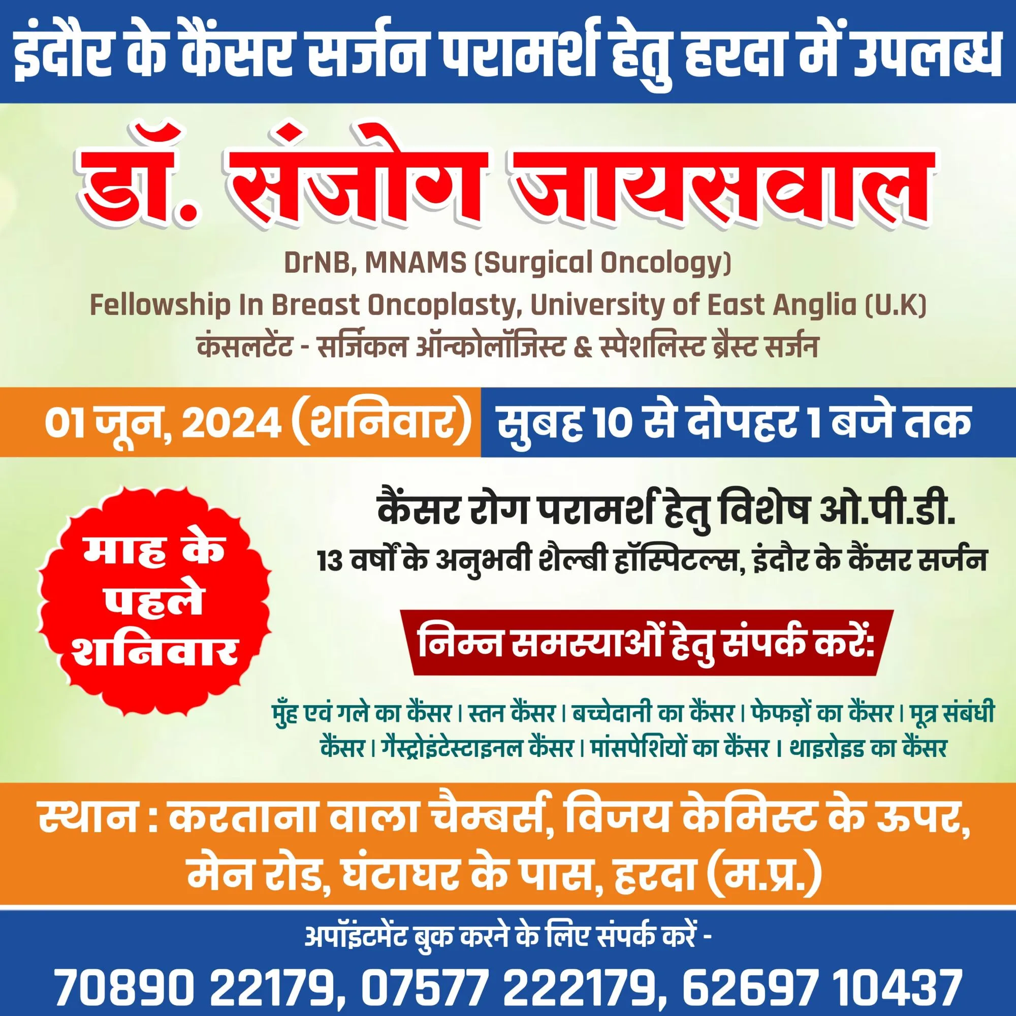 Blog इंदौर के कैंसर सर्जन परामर्श हेतु 1 जून को हरदा में विजय केमिस्ट ( करताना वाला ) उपलब्ध रहेंगे ! May 30, 2024 No Comments