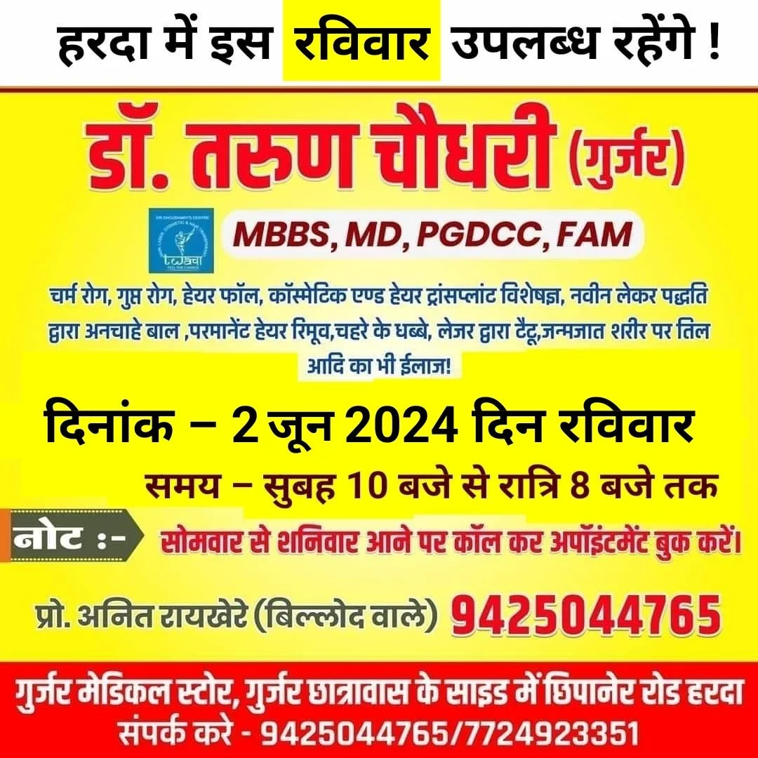 हरदा – इस बार इस रविवार 2 जून को हरदा में उपलब्ध रहेंगे चर्म रोग विशेषज्ञ डॉ. तरुण चौधरी (गुर्जर) गुर्जर मेडिकल स्टोर पर !