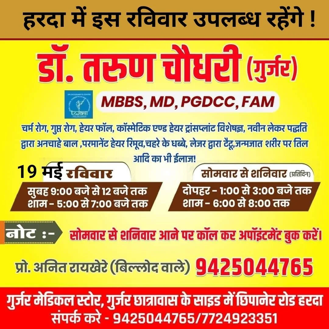 हरदा – हरदा में 19 मई रविवार को उपलब्ध रहेंगे चर्म रोग विशेषज्ञ डॉ. तरुण चौधरी (गुर्जर) गुर्जर मेडिकल स्टोर पर !