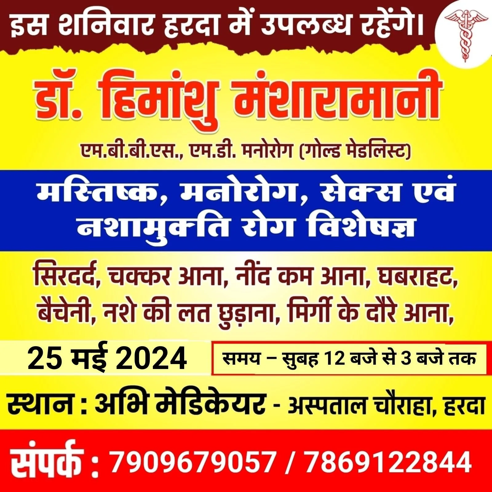 हरदा – 25 मई शनिवार अभि मेडिकेयर पर मस्तिष्क, मनोरोग, सेक्स,एवं नशामुक्ति रोग विशेषज्ञ डॉ हिमांशु मंशारामानी उपलब्ध रहेंगे!