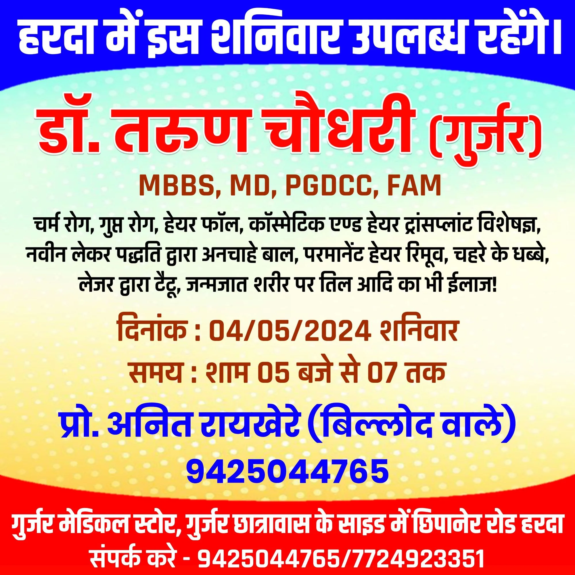 हरदा – इस बार इस शनिवार 4 मई को हरदा में उपलब्ध रहेंगे चर्म रोग विशेषज्ञ डॉ. तरुण चौधरी (गुर्जर) गुर्जर मेडिकल स्टोर पर !
